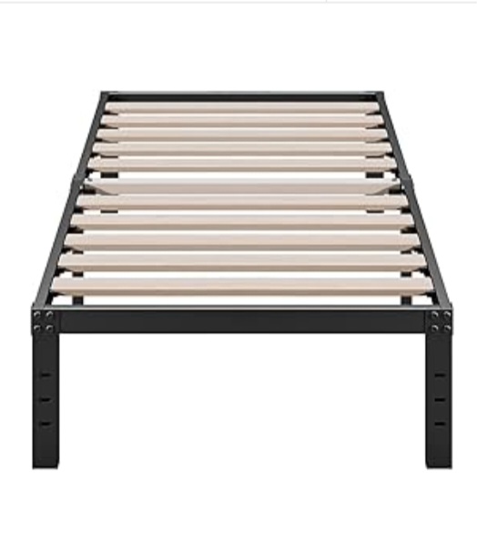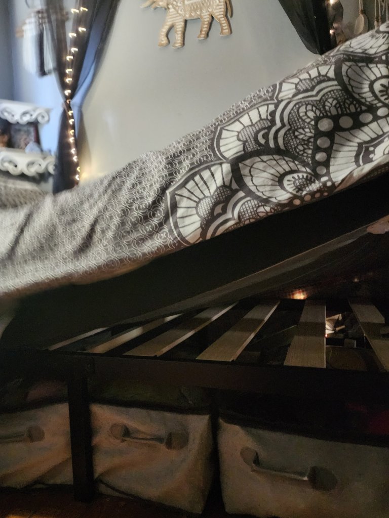 Except for this bedframe, it was extra. Just over a 100$ which was cheap. If you’re tired of a rickety bed frame, I found this heavy-duty twin wood metal frame that was very easy to put together and has held up perfectly with enough room for storage underneath.