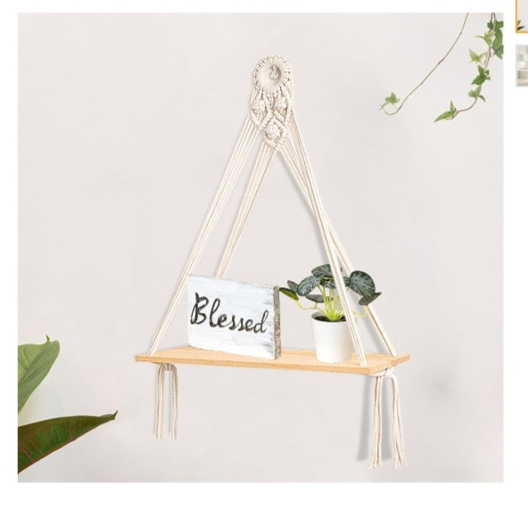 On to the next decor item, this cute woven hanging shelf. The natural wood bottom with the macrame gives the space a calming feel. Of course, it’s the perfect place for a lit lantern.